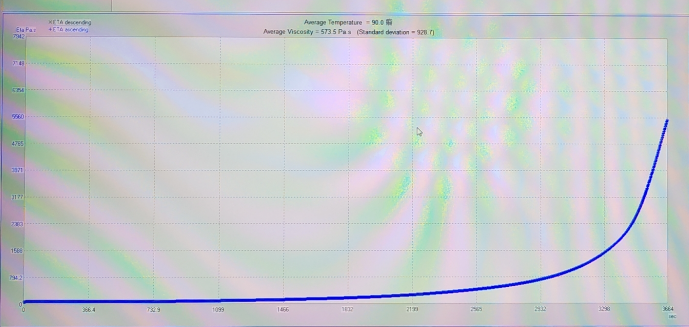樹脂固化是粘度值非常高,一般的粘度計或者流變儀如果量程比較小的話,還沒有開始固化已經超量程了,本次測試采用高量程的ETT CP6000流變儀,量程10000Pa.s以上,測試提示超量程后,停止測試,觀察發現樣品已經完全固化,凝固在轉子和底板上,本流變儀轉子和底板均采用硬質合金,可以直接用美工刀掛掉樣品;