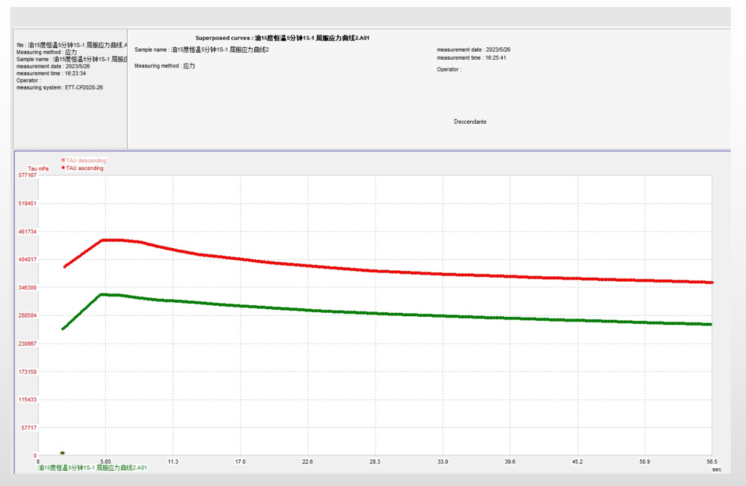 可測試測試不同的溫度下或者不同的剪切速率下的應力曲線,應力曲線的峰值就是我們需要的屈服應力值。